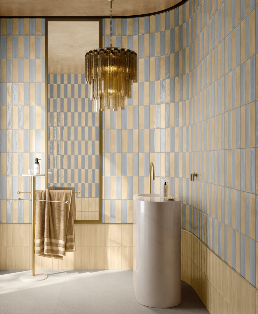 Colour Up (Pastorelli) punta su formato allungato e finitura lucida per esaltare la profondità cromatica con nuance ispirate alla natura; Plyta (Pastorelli) propone tonalità calde e materiche dal carattere organico; Ghiaccioli (Ceramica Faetano) gioca invece con colori pastello freschi e vibranti per superfici decorative dal forte impatto espressivo.